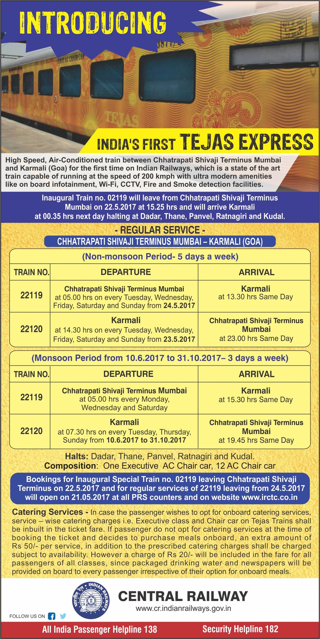 Central Railway On Twitter India S First Tejas Express To Run Between Mumbai And Karmali Goa From 22 5 2017 Bookings Open From 21 5 2017 Sureshpprabhu Https T Co Yfkg8od63b - The train was revealed to the public in mumbai on sunday.